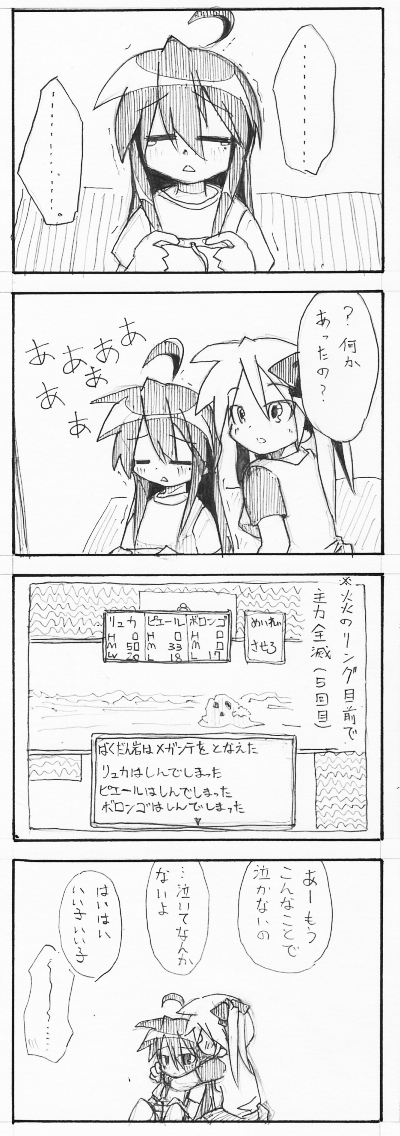 >メガンテは辛いですよねぇ、私も軽いトラウマが・・・。話は替わりますけど、私がこなかが描くと二人ともボケて延々ボケ続けることがよくありますw しっかりしようよ私の描くかがみ ! w